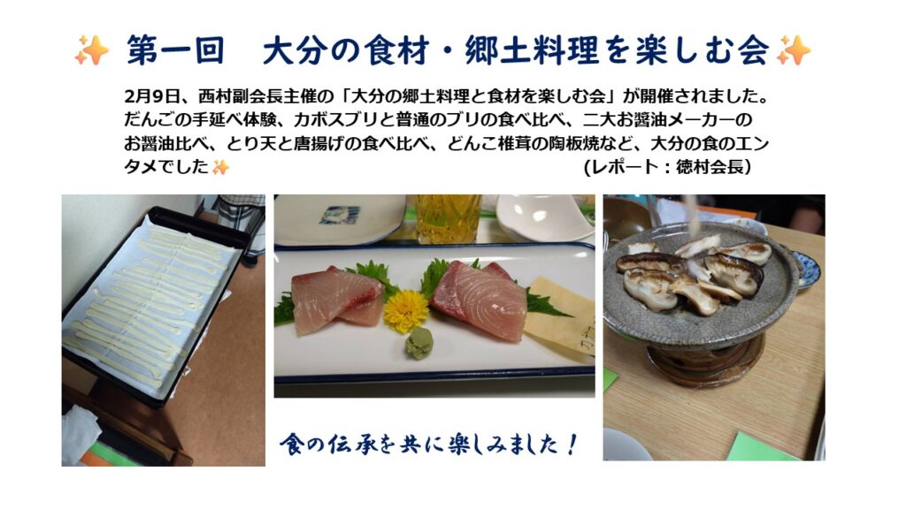 大分の食材を使ったお料理のレシピをご紹介したり、地元の郷土料理を楽しむ会です。
